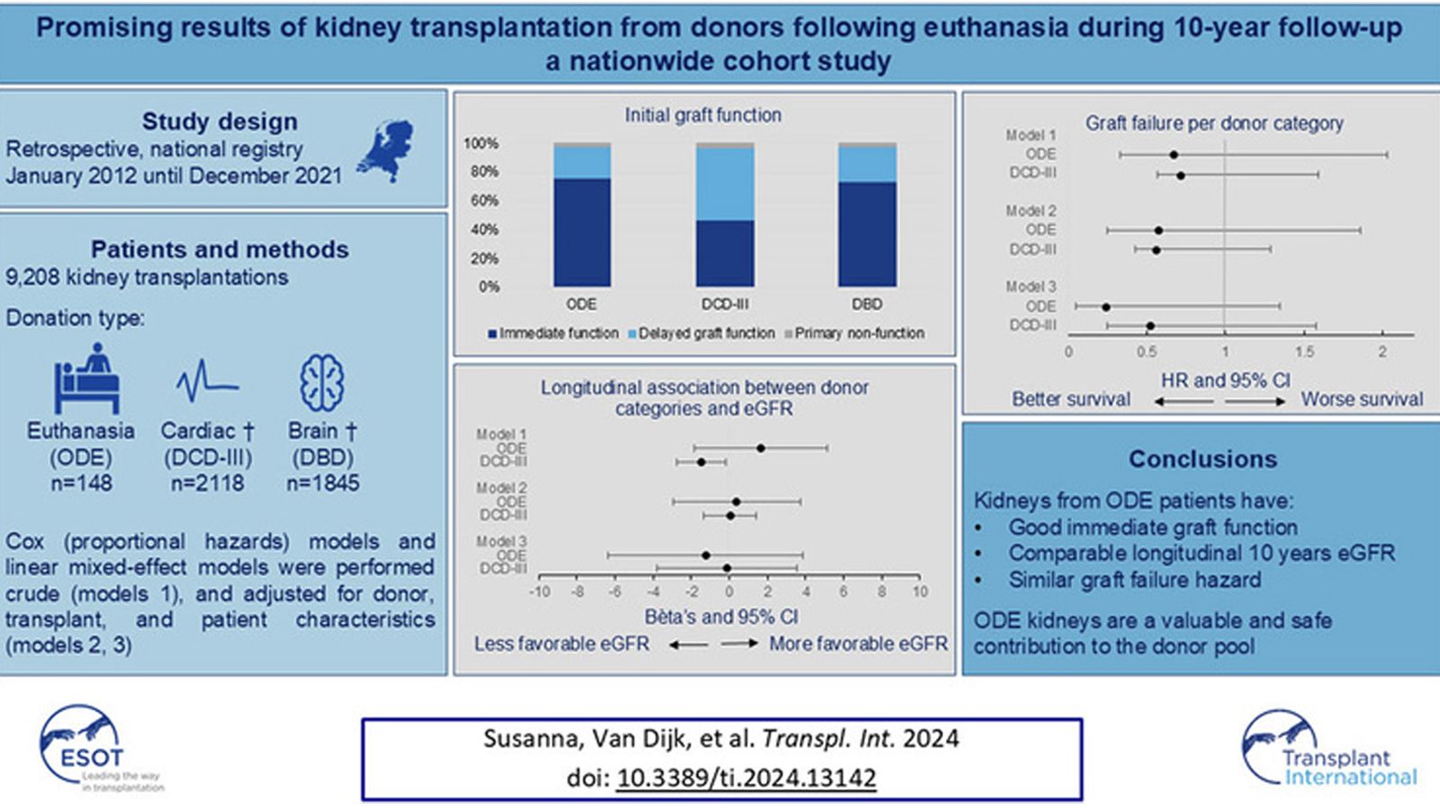 This nationwide cohort study evaluates the outcomes of kidney transplantation from organ donors following euthanasia (ODE) compared to those outcomes from controlled donors after circulatory death (DCD-III) and brain death (DBD) over a 10-year period in the Netherlands. Of the 9,208 transplants performed between 2012 and 2021, 148 were from ODE donors. The study assessed immediate graft function, estimated glomerular filtration rate (eGFR), and graft failure.